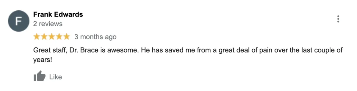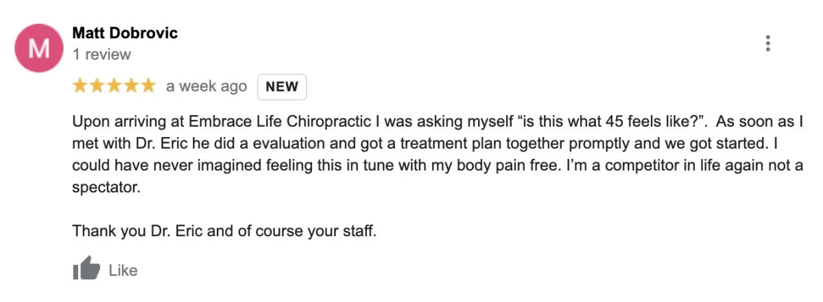 Disclaimer: Procedures and treatments performed by Embrace Life Chiropractic have an inherent success (and failure) rate. Reviews, testimonials and content on this site should not be interpreted as a statement of efficacy of procedures and treatments performed by Embrace Life Chiropractic for anyone else.